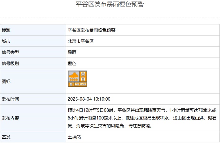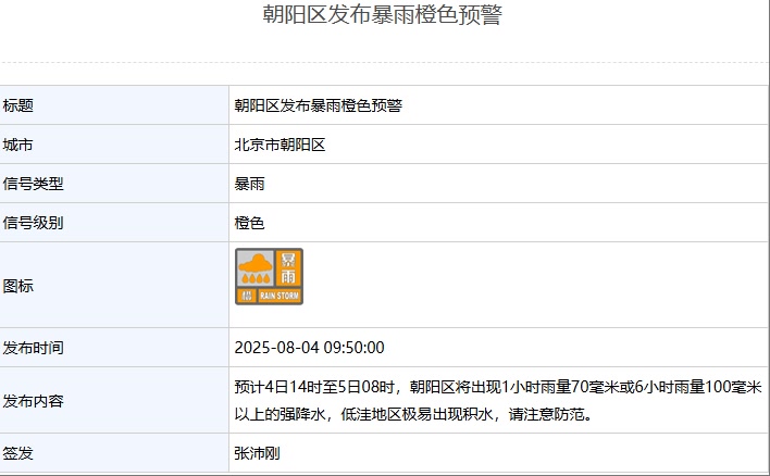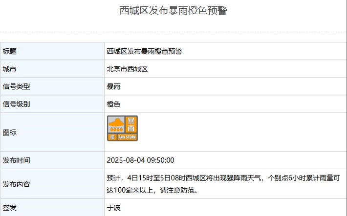 另据北京日报客户端8月4日援引北京市气象局消息,8月4日上午,北京市东城区、西城区、朝阳区、海淀区等9区发布暴雨橙色预警: