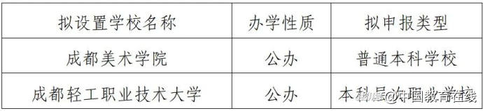 根据公示信息,拟设置的成都美术学院为公办普通本科,拟设置的成都轻工职业技术大学为公办职业本科。