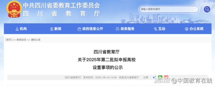 8月4日,四川省教育厅发布关于2025年第二批拟申报高校设置事项的公示。