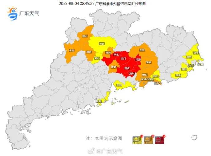 中央气象台8月4日10时继续发布暴雨橙色预警:预计,8月4日14时至5日14时,广东等地部分地区有大到暴雨,其中,广东中北部和东部沿海部分地区有大暴雨,广东中北部和东部沿海等地局地特大暴雨(250~350毫米)。伴有短时强降水(最大小时降雨量20~50毫米,局地可超过80毫米),局地有雷暴大风等强对流天气。