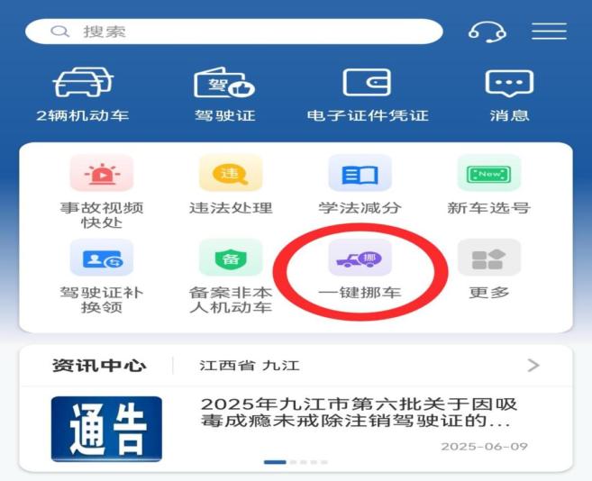 第一步:打开“交管12123”APP,点击【一键挪车】。