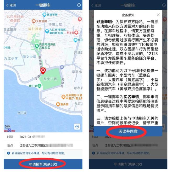 第二步:确认挪车地点,点击【申请挪车】,仔细阅读业务须知,点击【阅读并同意】。每位车主每月最多发起5次挪车通知,且挪且珍惜。