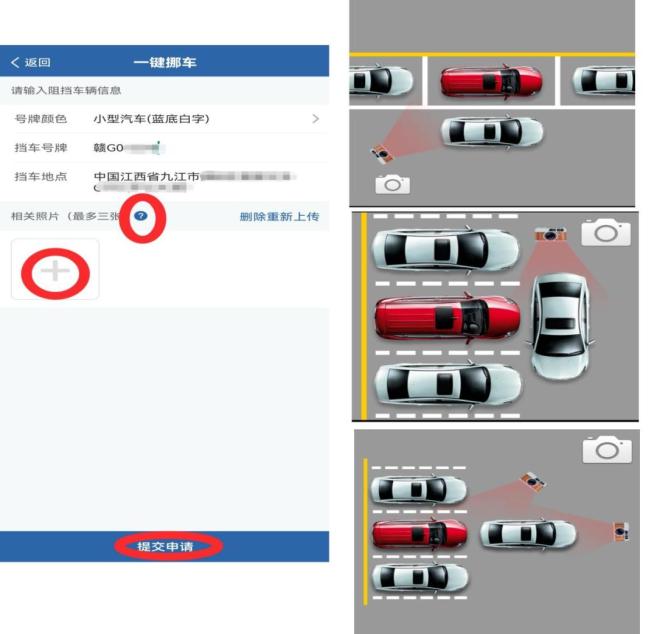 第三步:根据提示选择号牌颜色、挡车号牌、挡车地点,上传清晰的现场挡车照片(最多上传三张),点击【提交申请】(具体拍照要求可点击“相关照片”旁的问号标识查看)