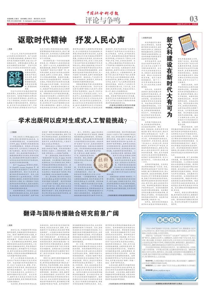 新时代,促进文化事业繁荣发展,提升国家文化软实力,增强国家综合国力,新文科建设责无旁贷。新征程,面对新的时代课题与现实要求,新文科必将发挥不可或缺的重要作用。