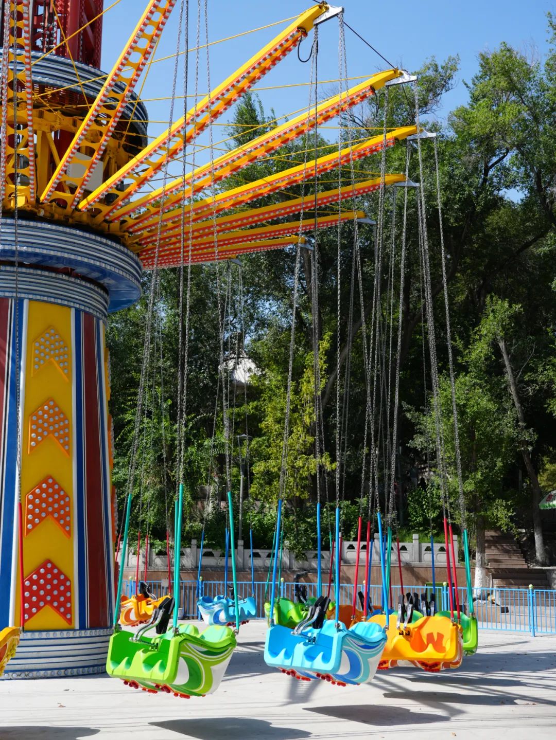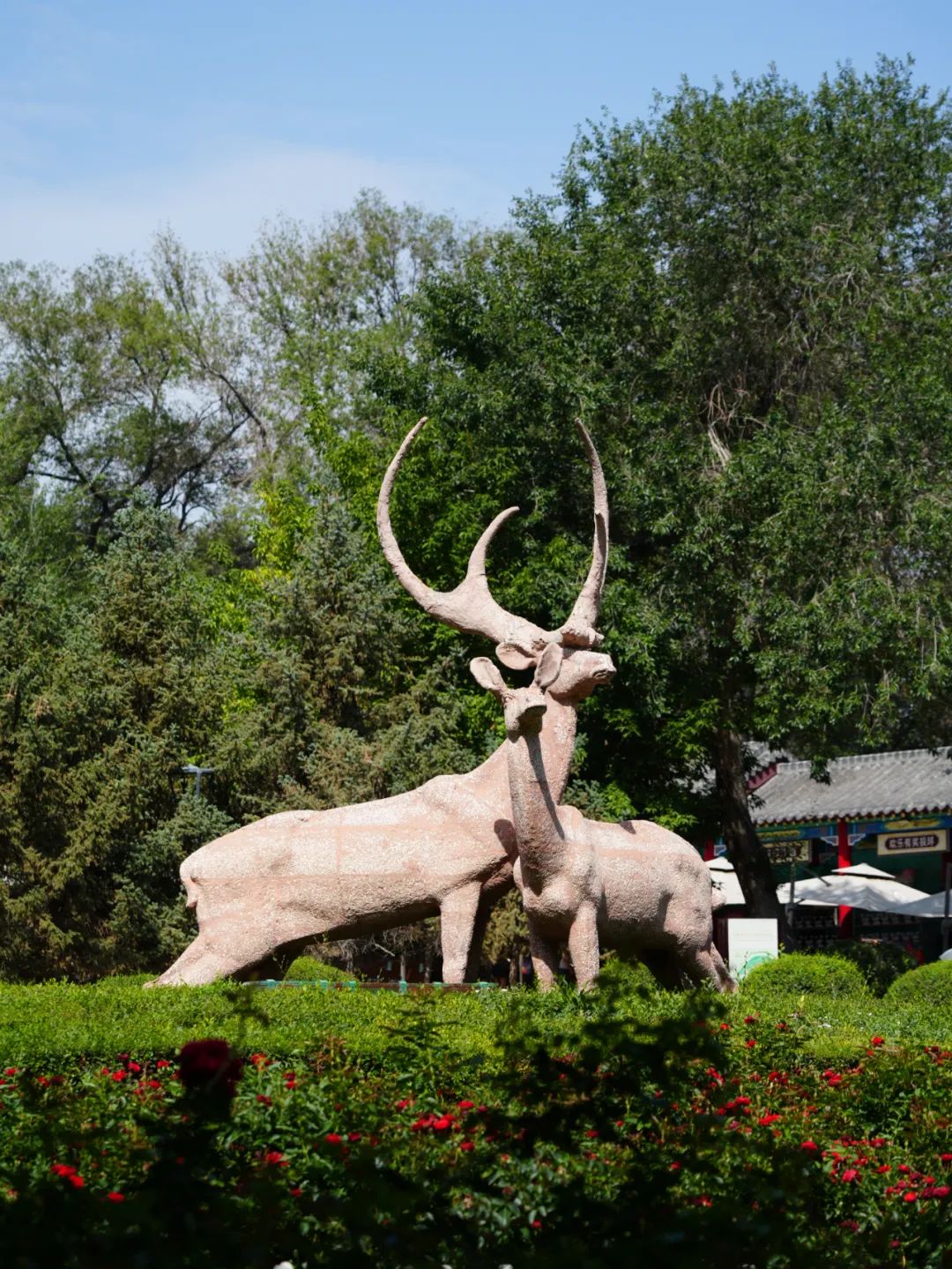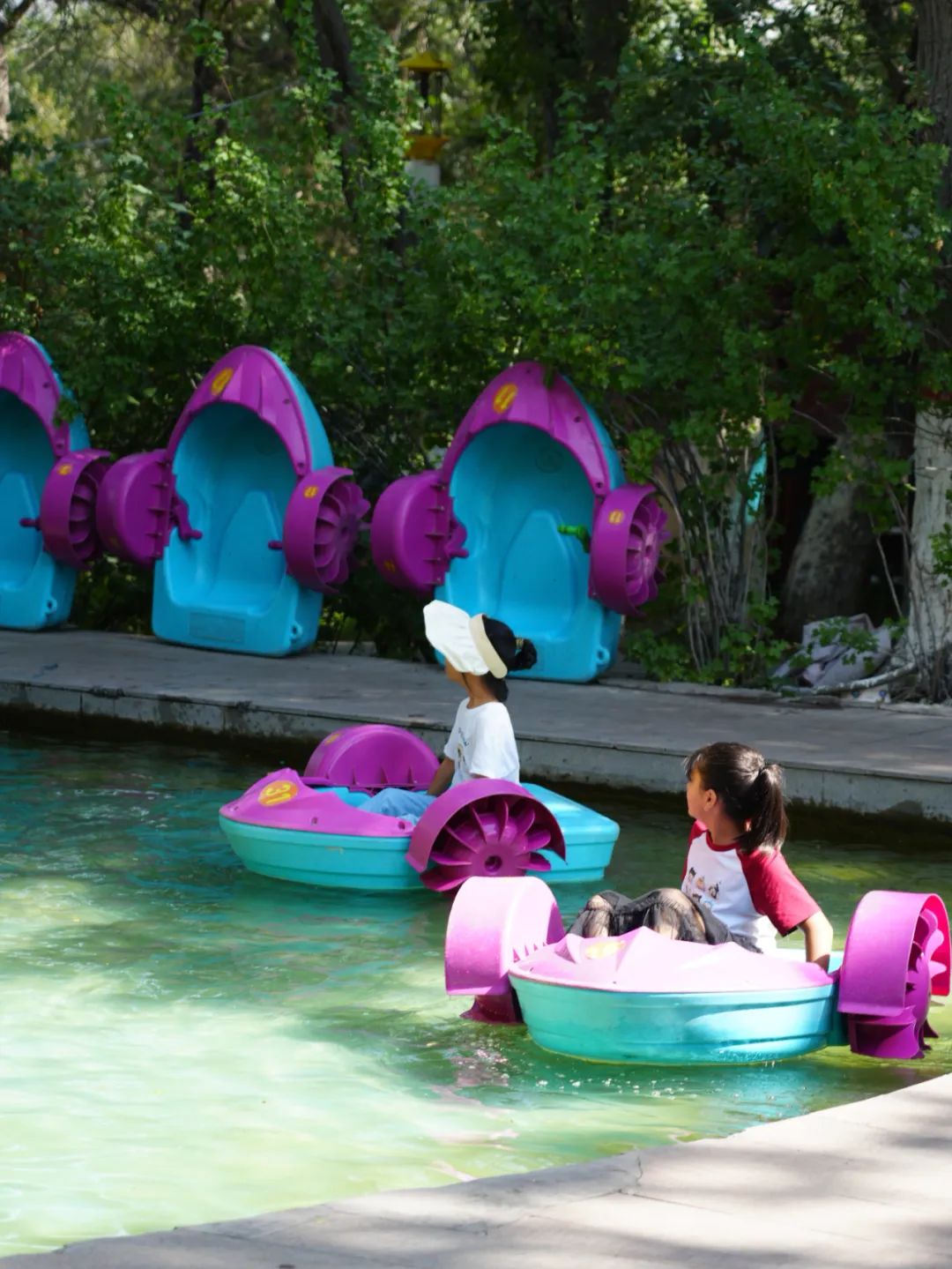 从公园南门进入,一对石雕迎宾双鹿静立在绿荫里。园内有儿童游乐区,比如经典摩天轮缓缓旋转、新建的旋转飞椅、一片可以划船的玩水区……