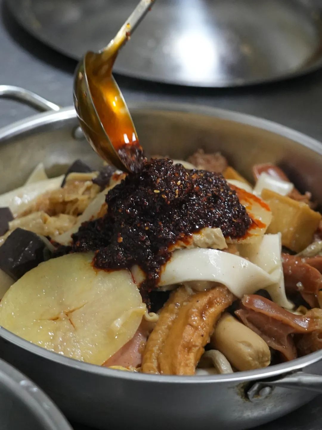 食材在滚水里烫熟捞起,浇上厚厚一勺自制辣椒面,连小铁锅一同端上桌。顶上那彤红油亮的辣椒,看得我有点被唬住。