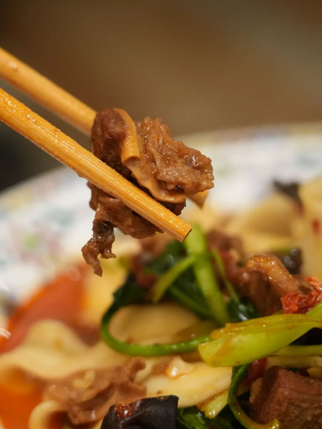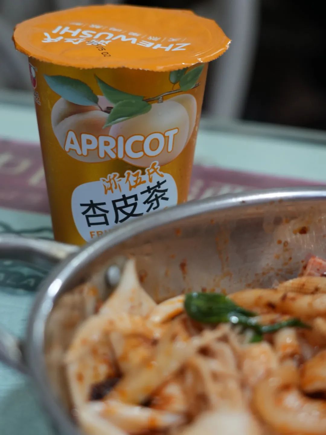 但入口却是惊奇,不怎么辣,而且很香。我最喜欢的是手擀粉,口感筋道滑溜。老板热情推荐说:“来尝尝甘肃的杏皮茶。”酸酸凉凉,立刻清爽不少。
