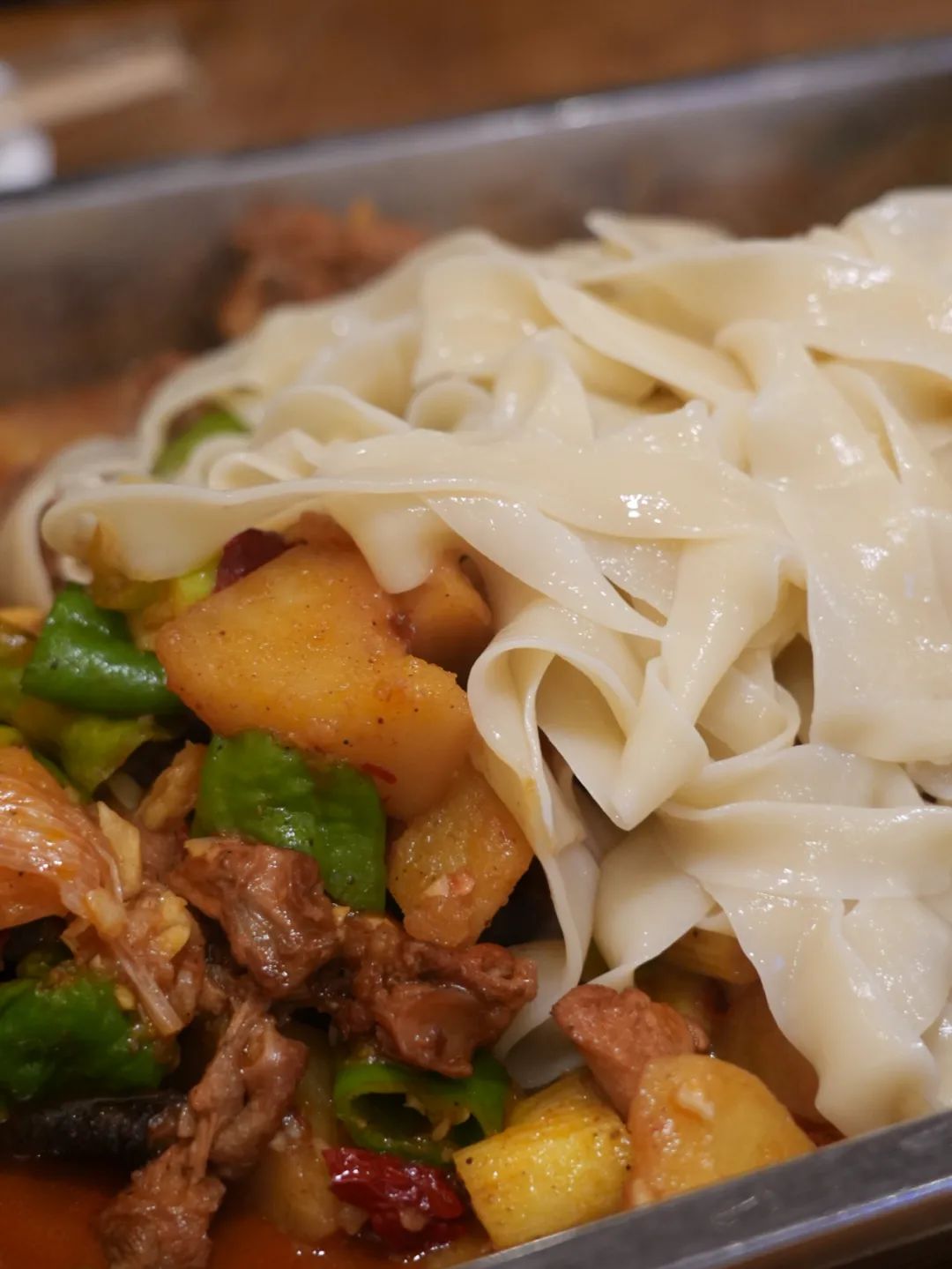 大盘鸡一上桌,得趁热把皮带面倒进盘里。面条裹满浓稠喷香的汤汁,很是满足。
