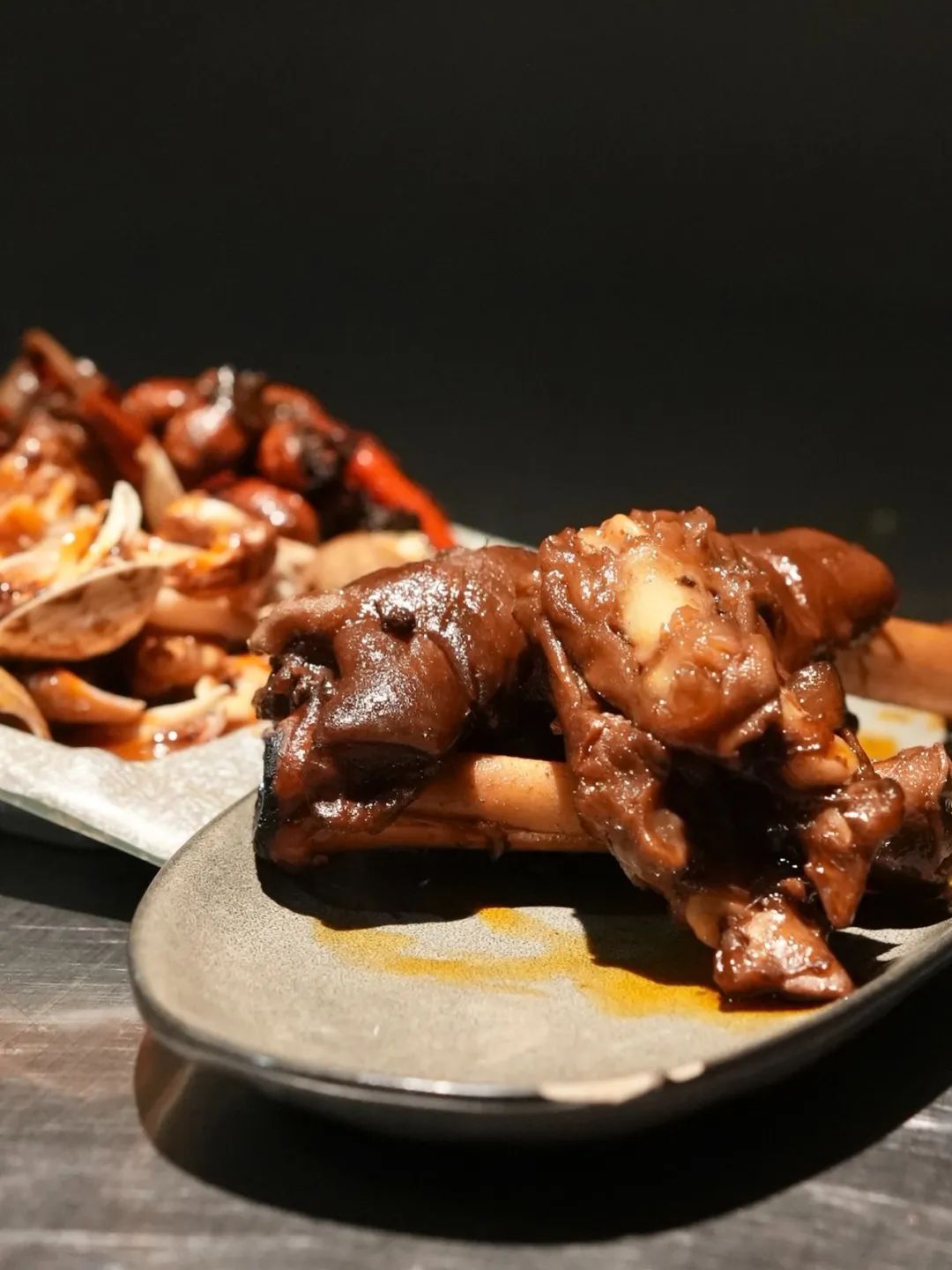 这里每天烤的东西都会有些变化,时不时出点类似于烤鸽子的“硬”菜。今天运气不错,撞见卤得油亮的羊蹄。自从搬远后,可是好久没尝到这一口了。羊蹄炖得烂乎,满满的胶质又糯又弹。