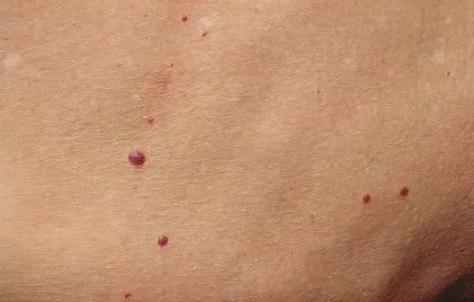 2. 刚开始是扁平红点,部分会长成1-5毫米的鲜红色圆顶状丘疹。