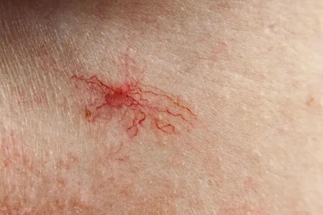 “蜘蛛痣”长这样:中央有个略隆起的小红点;周围有呈放射状分布的纤细毛细血管,形似蜘蛛腿。