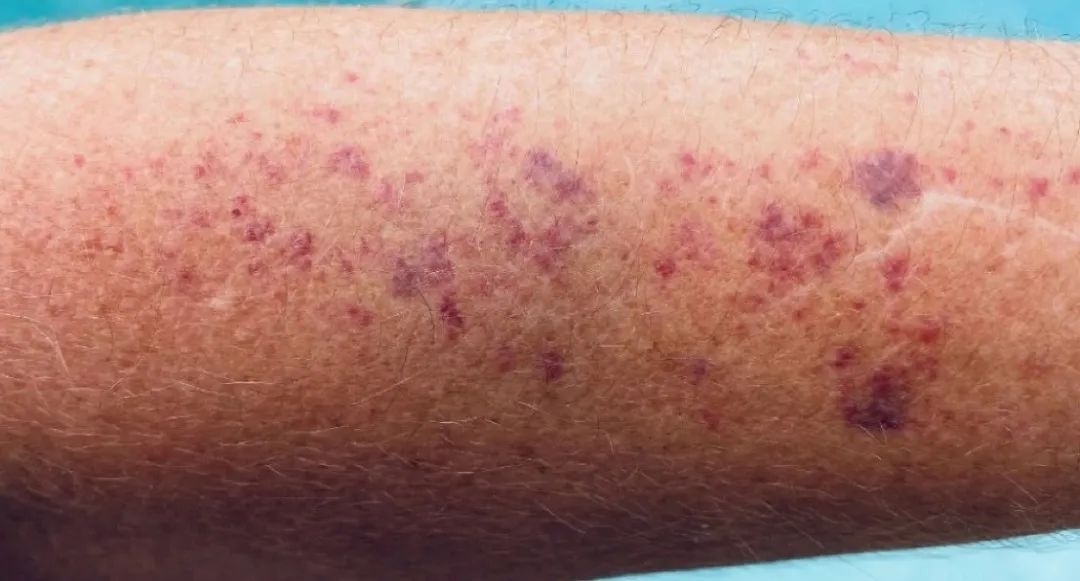 如果四肢前侧,尤其是双下肢出现对称分布、有瘙痒感、按压不褪色的红点或瘀斑,可能是过敏性紫癜,也叫IgA血管炎,是一种常见的血管过敏反应疾病。