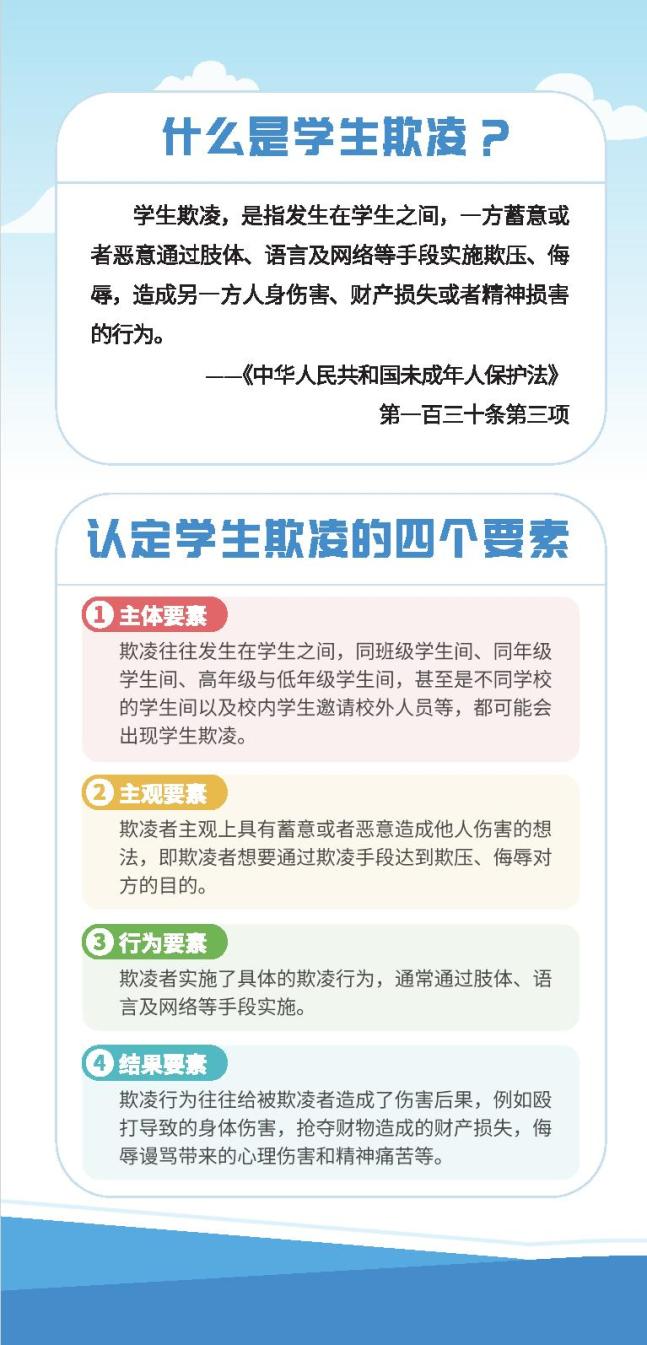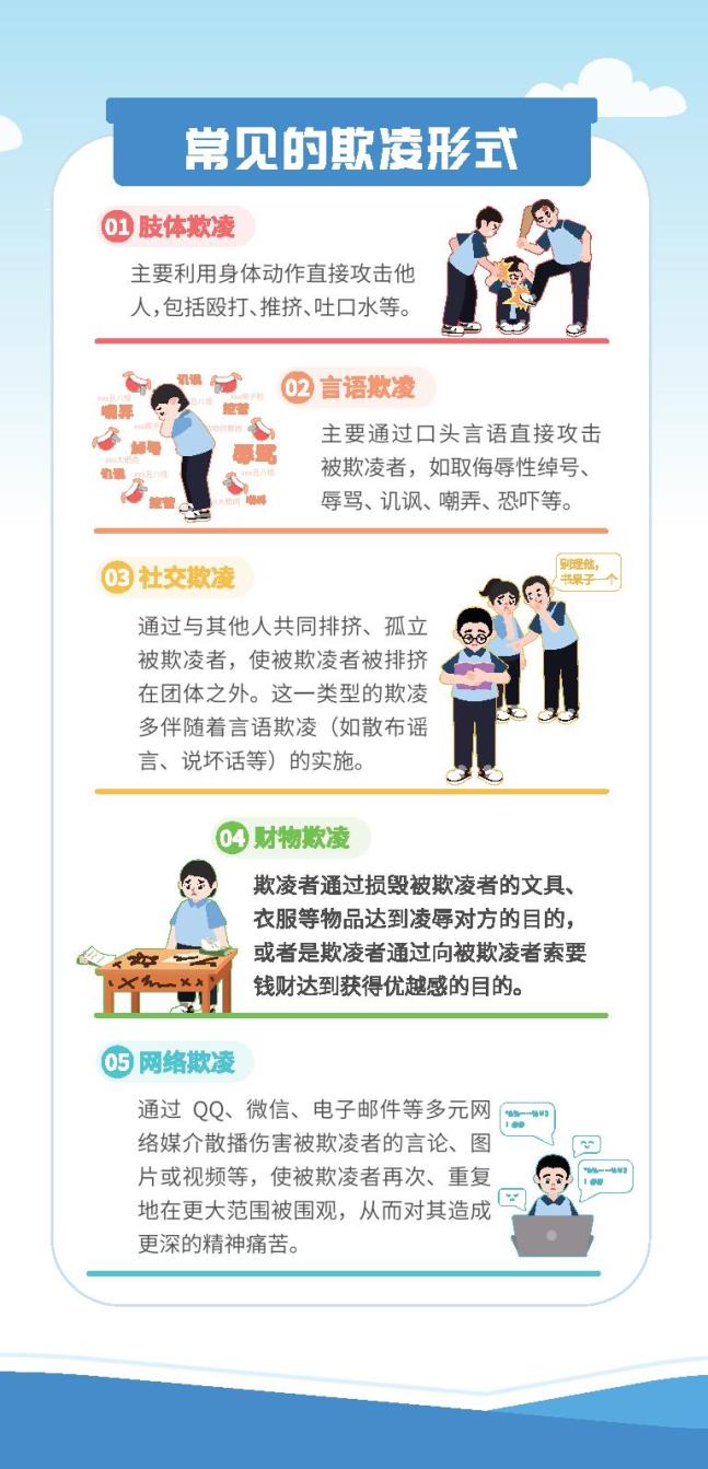 学生欺凌是指发生在学生之间,一方蓄意或者恶意通过肢体、语言及网络等手段实施欺压、侮辱,造成另一方人身伤害、财产损失或者精神损害的行为。学生欺凌主要包含以下五方面: