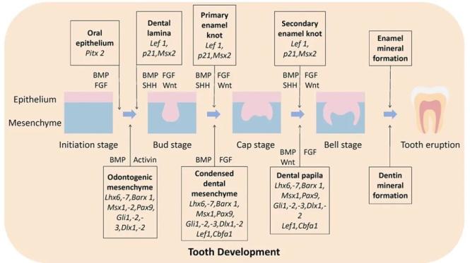 重点摘要牙齿的发育依赖于外胚层来源的上皮组织与中胚层来源的间充质的共同作用。在牙齿的形态建成与时空特异性发育期间,Wnt、BMP、FGF、Shh等信号分子起到了关键的调控作用,帮助上皮与间充质组织建立互作网络。例如,Wnt、BMP等信号通路对牙齿早期的形态决定与分化调控起到关键的作用;随后上皮组织分化为牙釉质,而间充质组织分化为牙乳头(牙本质与牙髓);进而在Wnt等信号通路的调控作用下,通过釉质矿化等作用形成完整的牙齿组织。此外,DNA甲基化、组蛋白修饰、非编码RNA调控等表观遗传修饰对牙齿发育的时空调控起到了同等重要的调节作用。