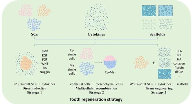 多种干细胞对牙齿组织的再生过程起到促进作用。例如,诱导多能干细胞可定向分化为牙釉质、牙本质、牙髓或牙周组织等;牙髓干细胞等成体干细胞的分化潜力相对局限,但临床应用风险更低。将干细胞与多种细胞因子(如BMP4、RA等)相结合,可以对牙齿再生过程起到更具特异性且高效的促进作用。例如,激活或抑制特定信号通路、促进细胞间或细胞与外基质间的互作,都可以为细胞的分化和再生提供更加合适的微环境。