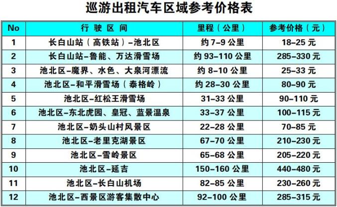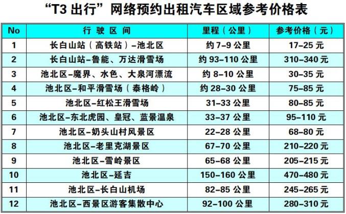 注:巡游网约出租汽车均可通过“T3出行”和“高德地图”等实现网络预约。网约出租汽车按平台计价规则执行。(长白山管委会交通运输局)发布热线:0433-5710661