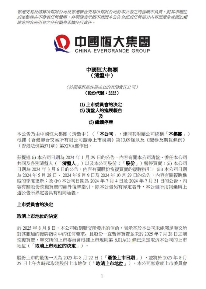 股份上市的最后一天为2025年8月22日,并将于8月25日上午9时起取消股份上市地位。中国恒大表示,公司无意就上市委员会作出取消上市地位的决定申请复核。