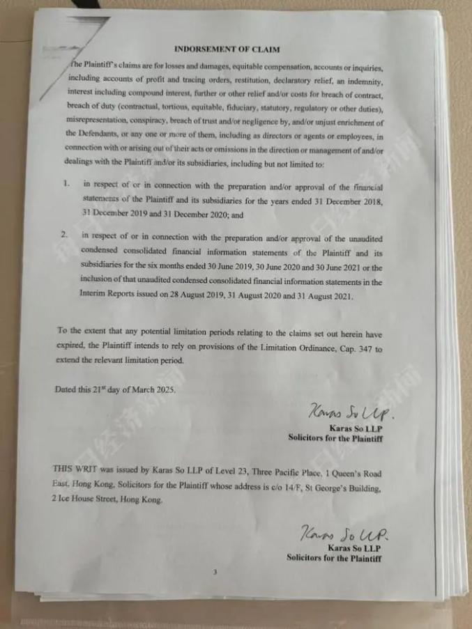 《每日经济新闻》记者从香港高等法院获取的起诉书显示,清盘人认为被告在管理中国恒大期间,因批准了2018至2020年的年度财务报表,以及批准2019至2021年未经审计的中期财务报表,涉嫌违反责任,因此提出索赔。