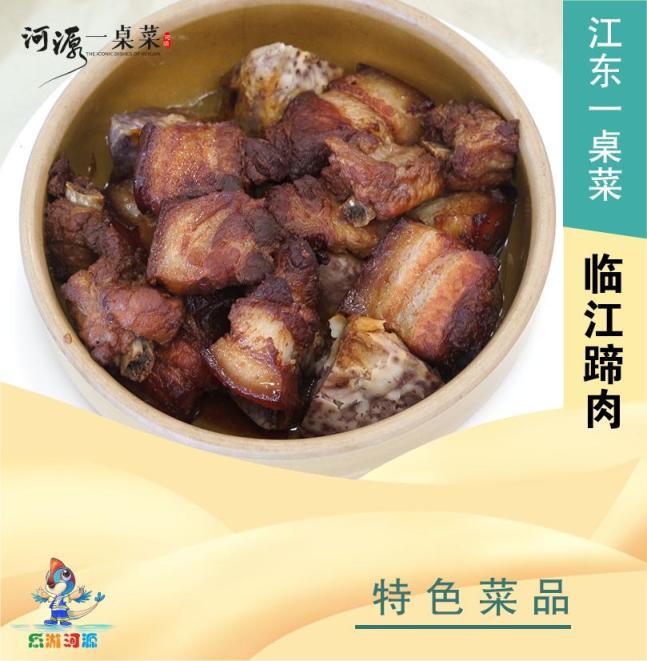 以当地土猪五花肉为原料,结合客家腌制工艺与东江水运文化,采用“腌制+油炸+蒸制”的特色技法,其腌制关键源于秘制料酒的配制——该料酒采用五香、八角、罗汉果等十余种香料,经半年至两年的浸泡陈化方可使用,再经油炸、蒸制使猪皮酥脆、肉质软糯,形成咸香入味、层次丰富的独特口感。它在传统客家菜基础上融入码头饮食文化,既是临江商贸与民俗结合的体现,又承载着客家人“节俭持家”“以食待客”的生活智慧,作为过年必备菜肴延续着“蒸蹄肉、待宾客”的民俗温度,成为地域文化在美食中的鲜活象征。05