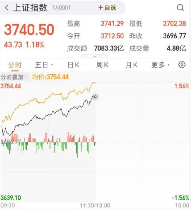 截至午间收盘,上证指数报3740.50点,涨1.18%。