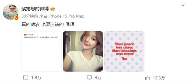 8月13日晚,赵露思发微博:“真的助农,也要注销的,拜拜。”
