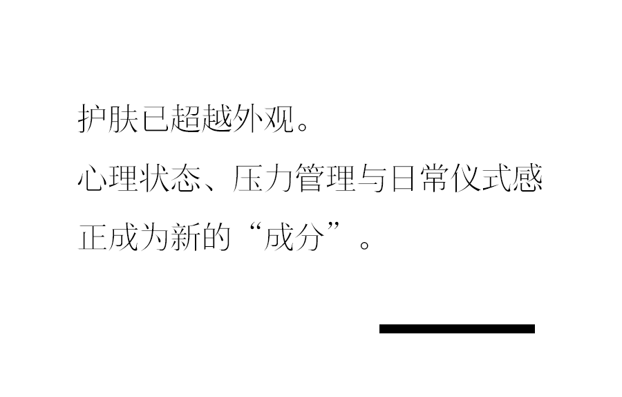 消费者已经对涂抹在肌肤上的各种成分了熟于心——无论是烟酰胺的浓度,还是关于肽的新突破——但越来越多研究证实,皮肤与大脑之间存在神经通路,压力、焦虑甚至睡前的情绪波动,都可能在第二天变成暗沉、干燥或爆痘等等皮肤问题。