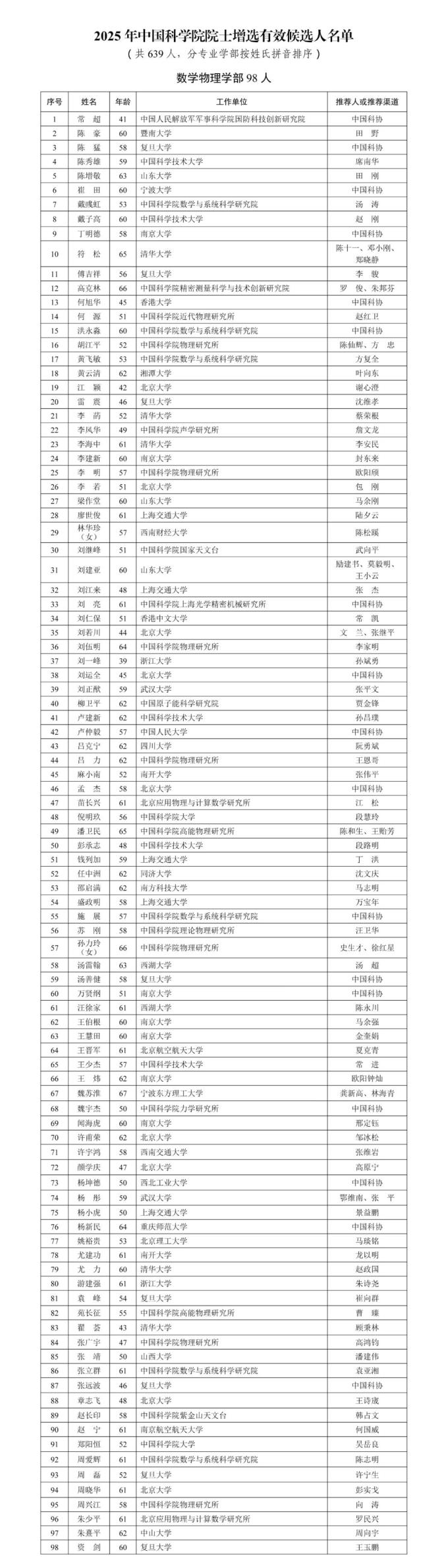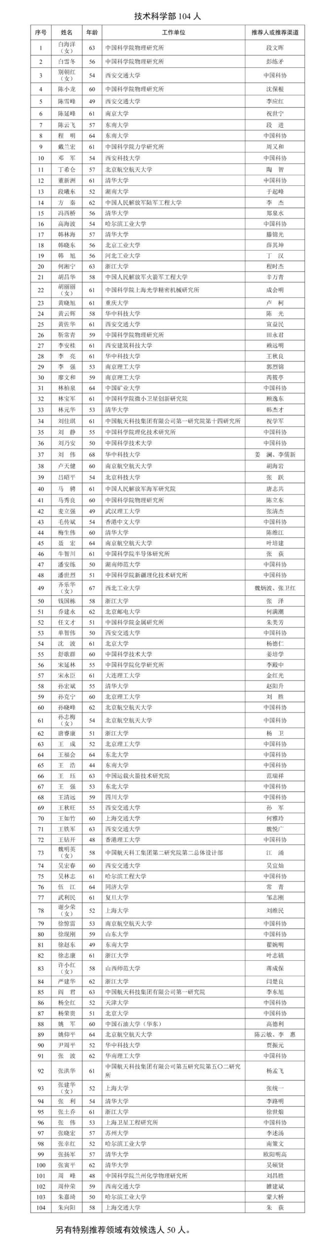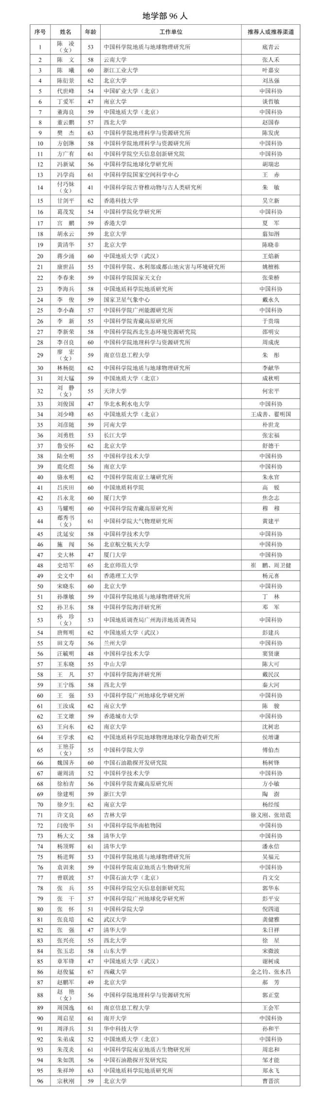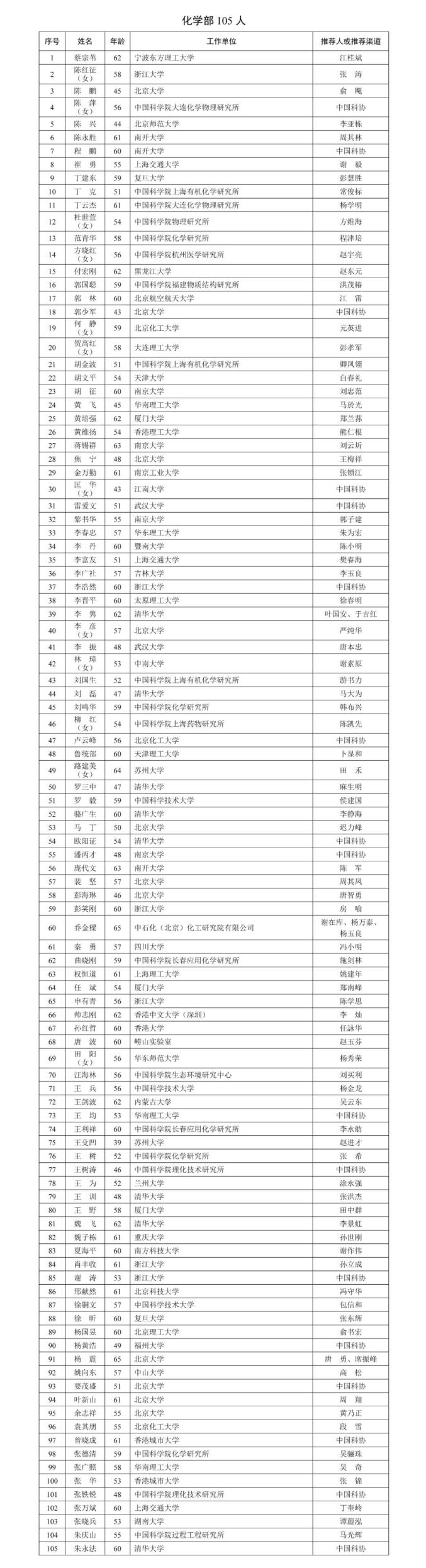 中国科学院公布的增选有效候选人名单中,包括数学物理学部98人,化学部105人,生命科学和医学学部125人,地学部96人,信息技术科学部61人,技术科学部104人,另有特别推荐领域50人。