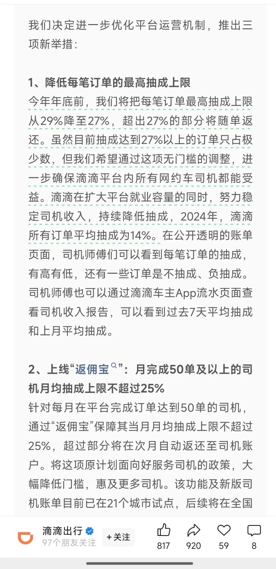 滴滴表示将在今年年底前,把每笔订单最高抽成上限从29%降至27%,超出27%的部分将随单返还。