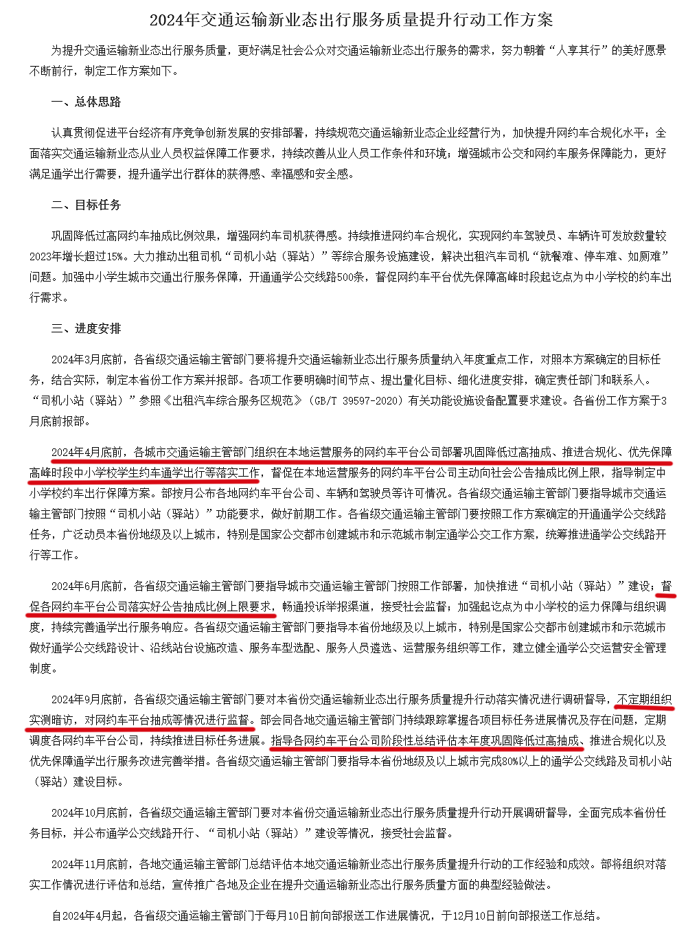 其中,2024年交通运输新业态出行服务质量提升行动工作方案中提到,持续规范交通运输新业态企业经营行为,全面落实从业人员权益保障,改善从业人员工作条件和环境,降低网约车平台过高抽成。