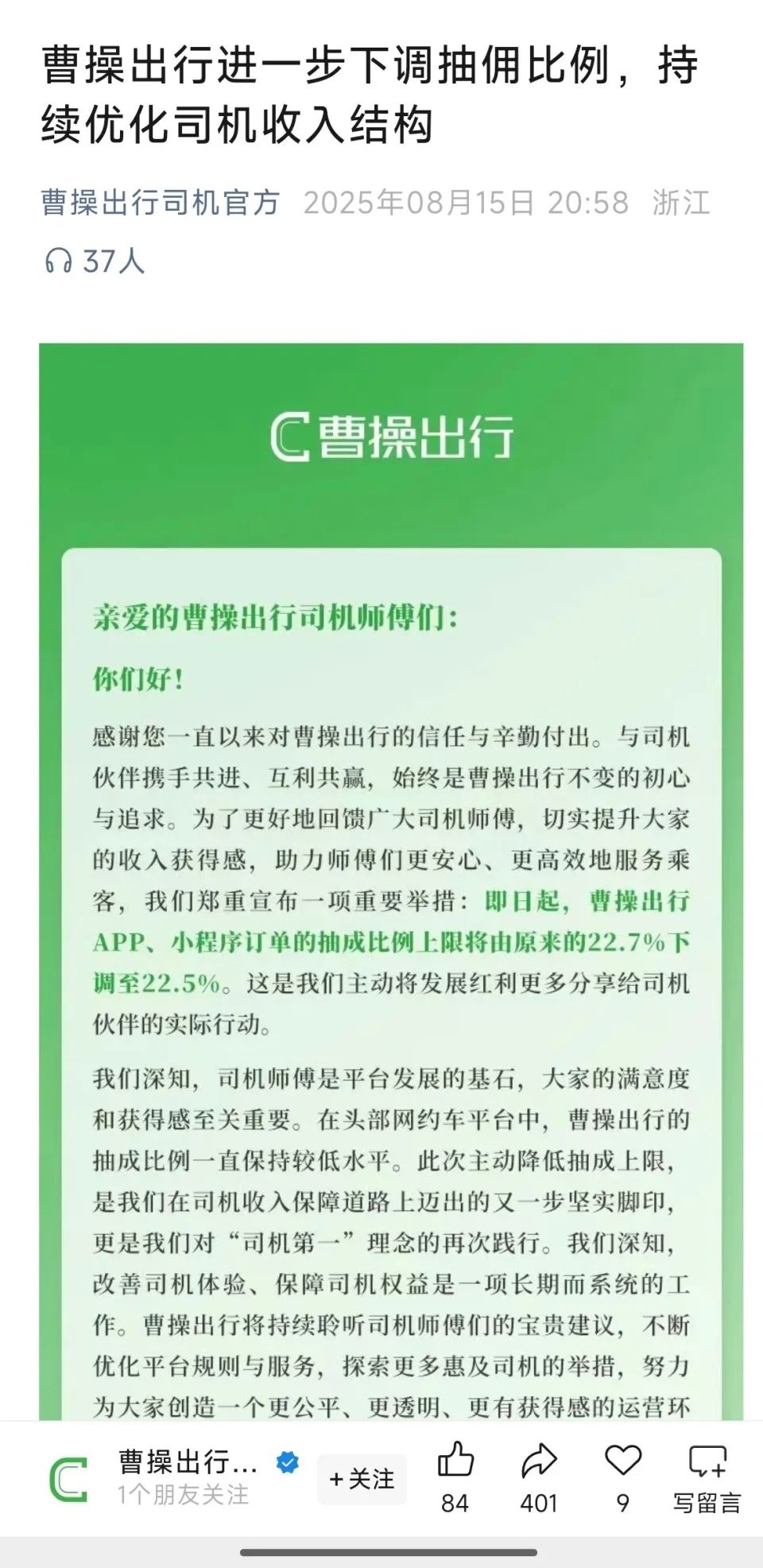 曹操出行亦发布公告表示,曹操出行APP、小程序订单的抽成比例上限将由原来的22.7%下调至22.5%,主动将发展红利更多分享给司机。
