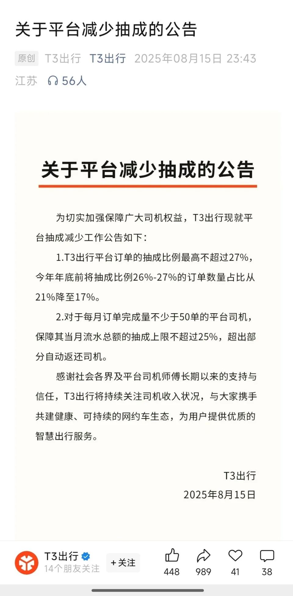 同日,T3出行发布公告称,平台订单的抽成比例最高不超过27%,今年年底前将抽成比例26%-27%的订单数量占比从21%降至17%。对于每月订单完成量不少于50单的平台司机,保障其当月流水总额的抽成上限不超过25%,超出部分自动返还司机。