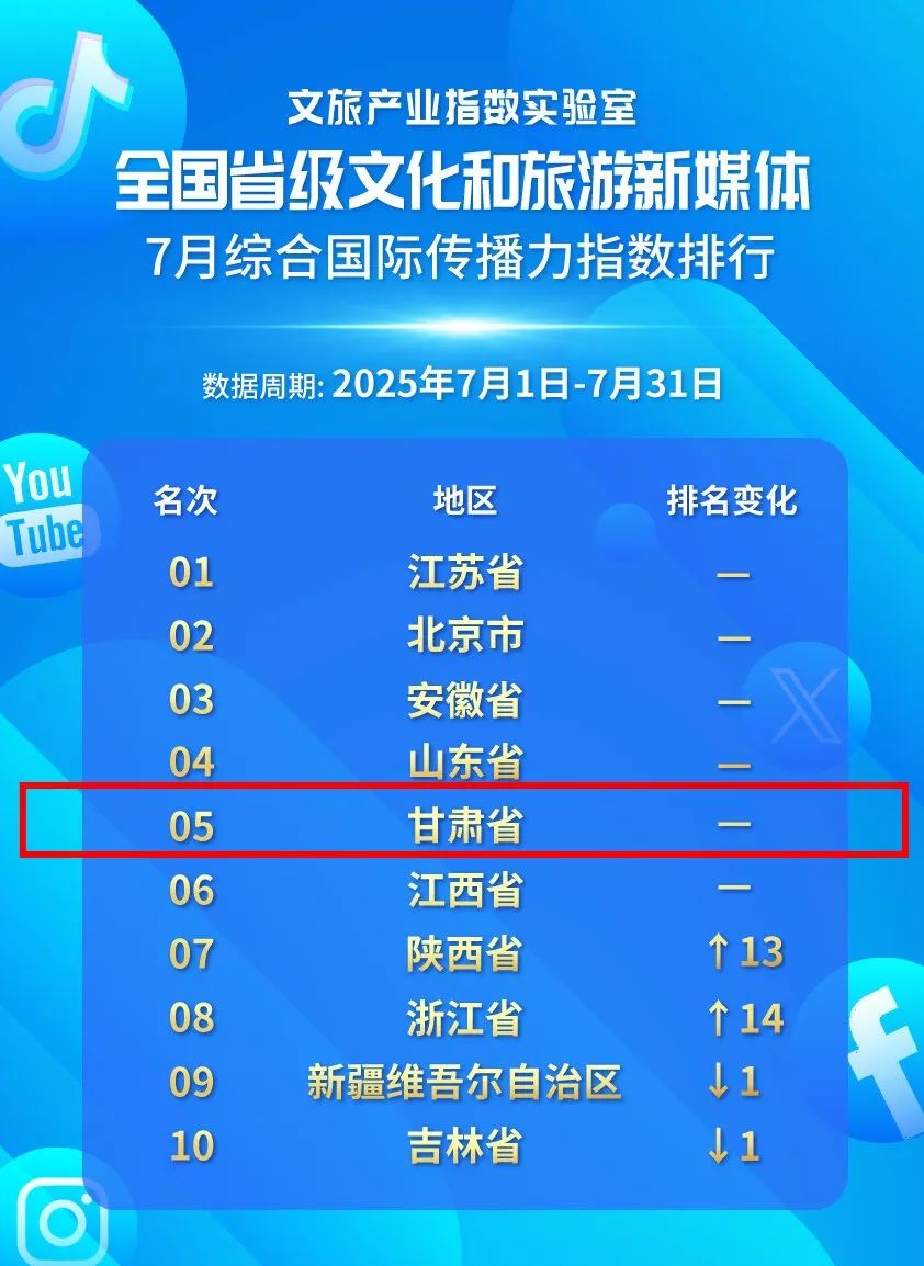 文旅产业指数实验室近日发布2025年7月全国省级文化和旅游新媒体国际传播力指数报告,甘肃5项全部上榜。其中在综合国际传播力指数排名第5,在Facebook传播力指数排名第3,在X(原Twitter)传播力指数排名第2,在Instagram传播力指数排名第9,在海外视频平台传播力指数排名第9。