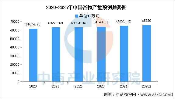 近年来,中国谷物产量整体维持在60000万吨以上,呈现稳定增长趋势。中商产业研究院发布的《2024-2029年中国农产品产业深度分析及产业发展风险研究预测报告》显示,2024年中国谷物产量65229万吨,比2023年增加1086万吨,增长1.7%。中商产业研究院分析师预测,2025年中国谷物产量将继续增长至65920万吨。