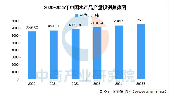 中商产业研究院发布的《2024-2029年中国农产品产业深度分析及产业发展风险研究预测报告》显示,2024年全年水产品总产量7366.5万吨,比上年增长3.5%。其中,养殖产量6062万吨,增长4.3%;捕捞产量1305万吨,下降0.1%。中商产业研究院分析师预测,2025年中国水产品产量将继续增长至7535万吨。