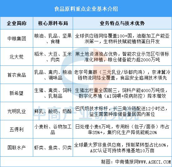 当前食品原料行业正加速向规模化、标准化、绿色化 转型,头部企业通过全产业链整合强化资源控制力,同时技术创新推动基础原料(如植物蛋白、低温乳品)向高附加值升级,供应链韧性建设成为竞争核心。中粮、北大荒等龙头企业依托全产业链与技术创新主导基础原料供应,新希望、光明聚焦细分领域高效产能,五得利、国联水产通过专业化生产强化品类壁垒,共同构建中国食品原料安全体系。