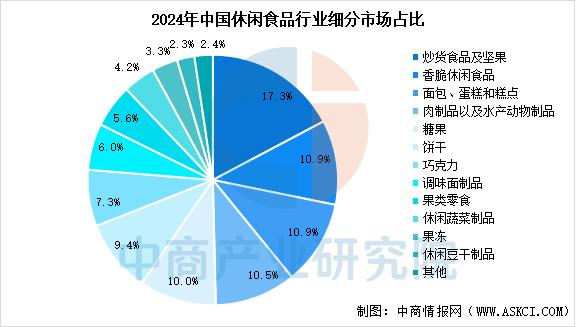 2024年,中国休闲食品细分市场规模排名前五的是炒货食品及坚果、香脆休闲食品、面包、蛋糕和糕点、肉制品以及水产动物制品、糖果。其中,炒货食品及坚果占比最多,达17.3%,其次分别为10.9%、10.9%、10.5%、10.0%。