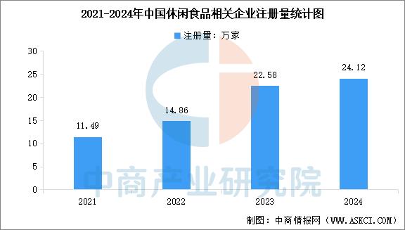 近年来,国内休闲食品相关企业注册量呈稳步增长状态。企查查数据显示,中国目前约有106.40万余家经营范围含“休闲食品、零食”,且状态为在业、存续的企业。2024年,中国休闲食品新增企业注册量达24.12万家,较上年增长6.82%。