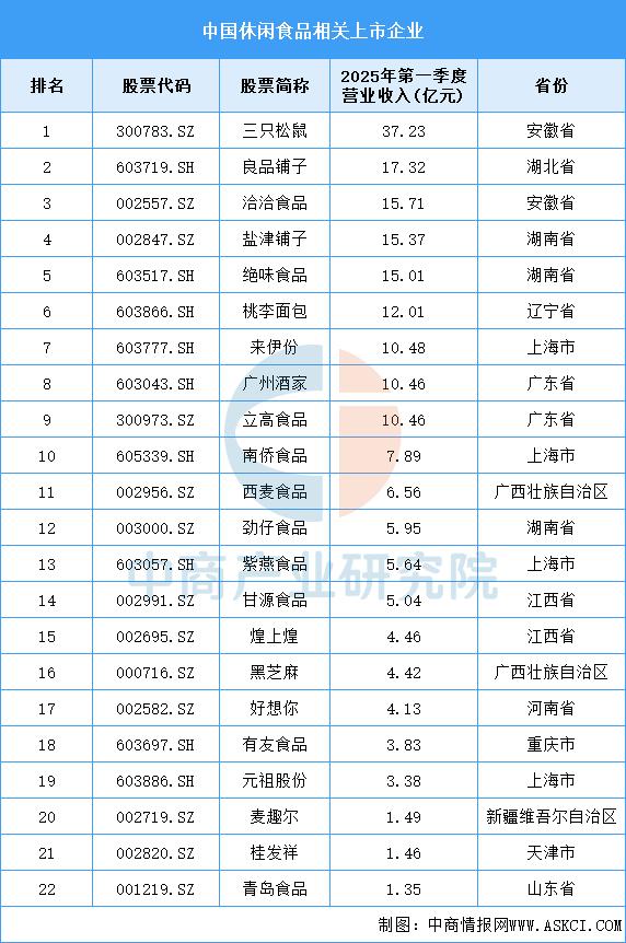 目前,中国A股上市休闲食品相关企业数量较少,其中上海市数量最多,共4家。2025年第一季度营收最高的是三只松鼠,营业收入达37.23亿元。