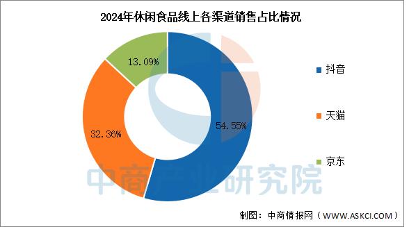 在线上渠道中,抖音休闲零食份额占比持续飙升,2024年渠道份额已达54.55%,逐渐成为休闲零食线上销售的中流砥柱。天猫和京东占比分别为32.36%和13.09%。