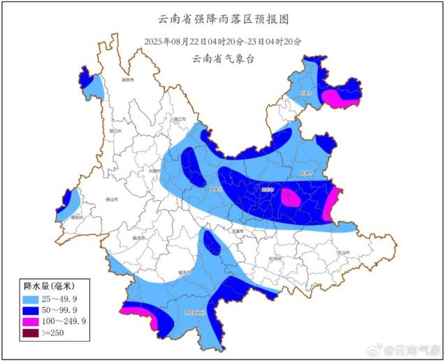 8月22日08时—8月23日08时:昭通市、曲靖市、昆明市、楚雄州、玉溪市、丽江市南部、大理州东部、临沧市、普洱市、西双版纳州、红河州、文山州北部、德宏州西部、怒江州北部阴有大雨局部暴雨、大暴雨,其他地区阴有中雨局部大雨。