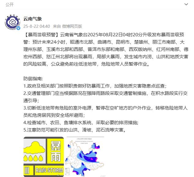 据云南省气象局官方微博@云南气象 消息,云南省气象台2025年08月22日04时20分升级发布暴雨Ⅲ级预警:预计未来24小时,昭通市北部、曲靖市、昆明市、楚雄州、丽江市南部、大理州东部、玉溪市北部和西部、普洱市东部和南部、西双版纳州、红河州南部、德宏州西部、怒江州北部将出现暴雨,局部大暴雨,发生城市内涝、山洪和地质灾害的风险较高,公众避免前往低洼地带,危险地带人员暂停作业。