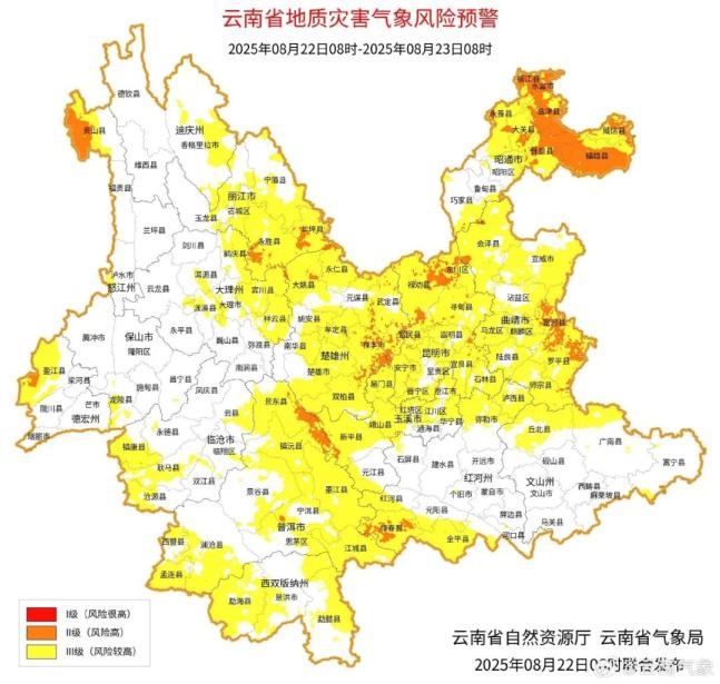 8月22日08:00—08月23日08:00,昆明市禄劝县、东川区、寻甸县、嵩明县、宜良县、石林县、安宁市、富民县,昭通市昭阳区、永善县、绥江县、水富市、盐津县、威信县、镇雄县、彝良县、大关县、巧家县,曲靖市马龙区、麒麟区、会泽县、宣威市、富源县、罗平县、师宗县、陆良县,玉溪市易门县、峨山县、新平县,楚雄州禄丰市、武定县、元谋县、永仁县、大姚县、牟定县、双柏县,红河州石屏县、绿春县、元阳县、金平县,普洱市景东县、镇沅县、宁洱县、江城县,大理州鹤庆县、宾川县,德宏州盈江县,丽江市华坪县、永胜县,怒江州贡山县,临沧市镇康县发生滑坡泥石流的风险高;昆明市大部,昭通市大部,曲靖市大部,玉溪市大部,保山市南部,楚雄州大部,红河州北部、南部,文山州北部、东部,普洱市大部,大理州北部至东部,德宏州西北部,丽江市大部,怒江州北部、南部,迪庆州东部,临沧市东部、西南部发生滑坡泥石流的风险较高。