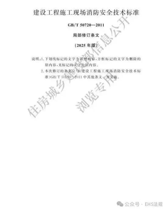 《建设工程施工现场消防安全技术标准》(GB/T 50720-2011,2025年版)是对原《建设工程施工现场消防安全技术规范》(GB 50720-2011)的局部修订,由住房和城乡建设部于2025年6月30日批准,并将于2025年11月1日起实施 。