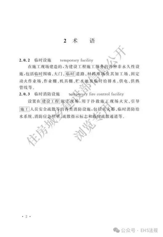 术语调整:“临时消防设施”中“疏散指示标识”统一改为“疏散指示标志”,与现行《建筑设计防火规范》GB 50016术语一致表述更规范;“临时设施”中“围墙”细化为“临时围墙”,强调其临时属性,避免与永久性工程围墙混淆。