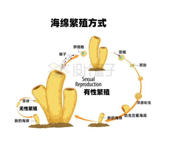海绵无明显的组织,体表和内腔各有一层细胞,中间为中胶层。单沟系海绵的内层,由领细胞构成,领细胞的主要功能是引起水流,并捕捉食物粒。中胶层中的原细胞,又称变形细胞,能把领细胞摄取的食物送到身体各部,又能演变为多种细胞,在再生中起作用,必要时可生成雌、雄生殖细胞。海绵可以通过多种方式繁殖,包括无性繁殖(如芽殖)和有性繁殖(如精子与卵子结合)。无性繁殖是指海绵的一部分脱落并长成一个新的个体,而有性繁殖则涉及精子和卵子的结合,形成受精卵,然后发育成新的个体。