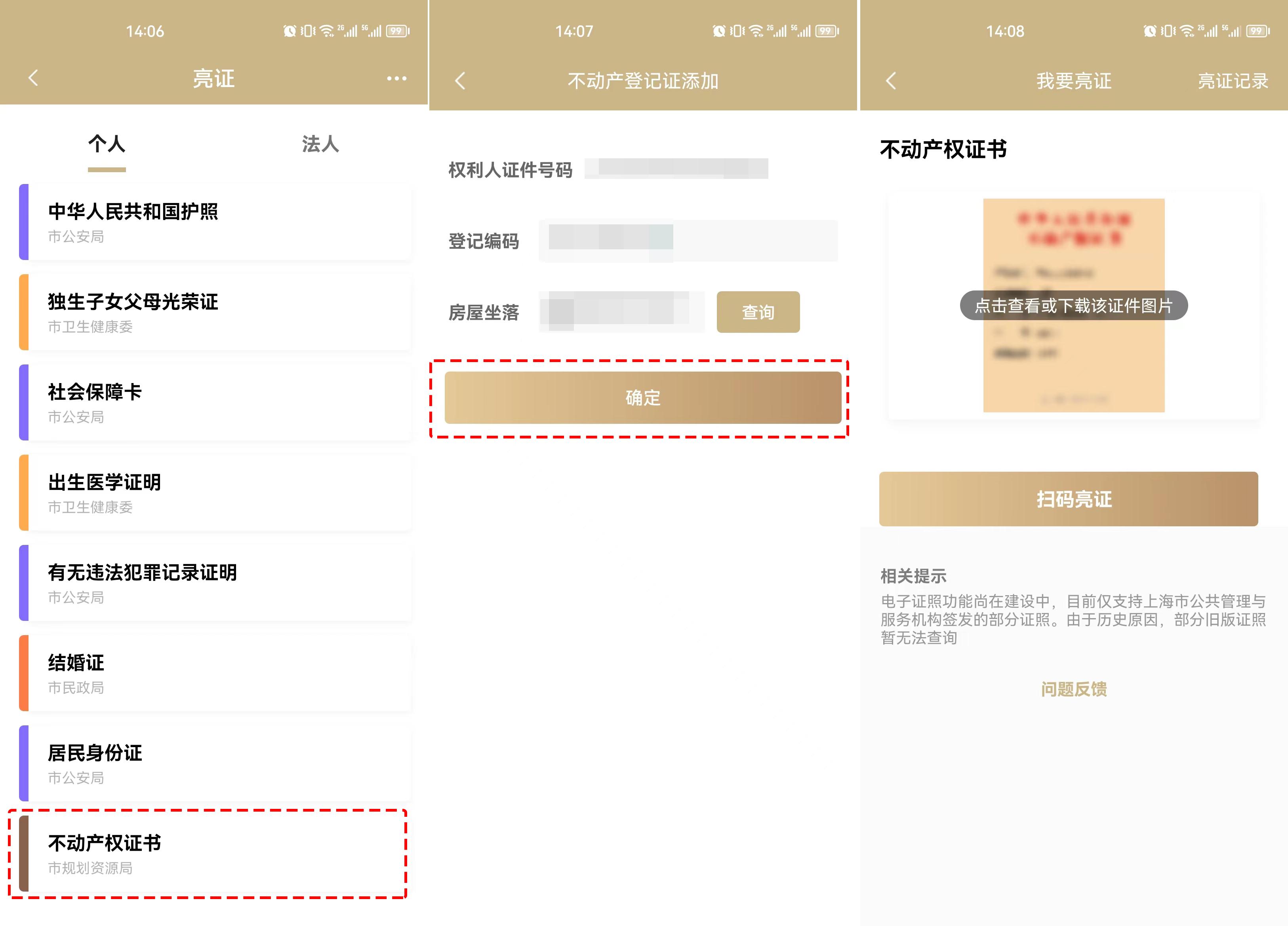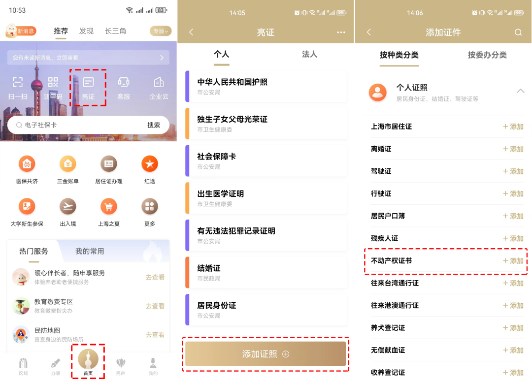 实名登录“随申办市民云”APP→点击首页“亮证”→点击“添加证照”→点击“不动产权证书”。