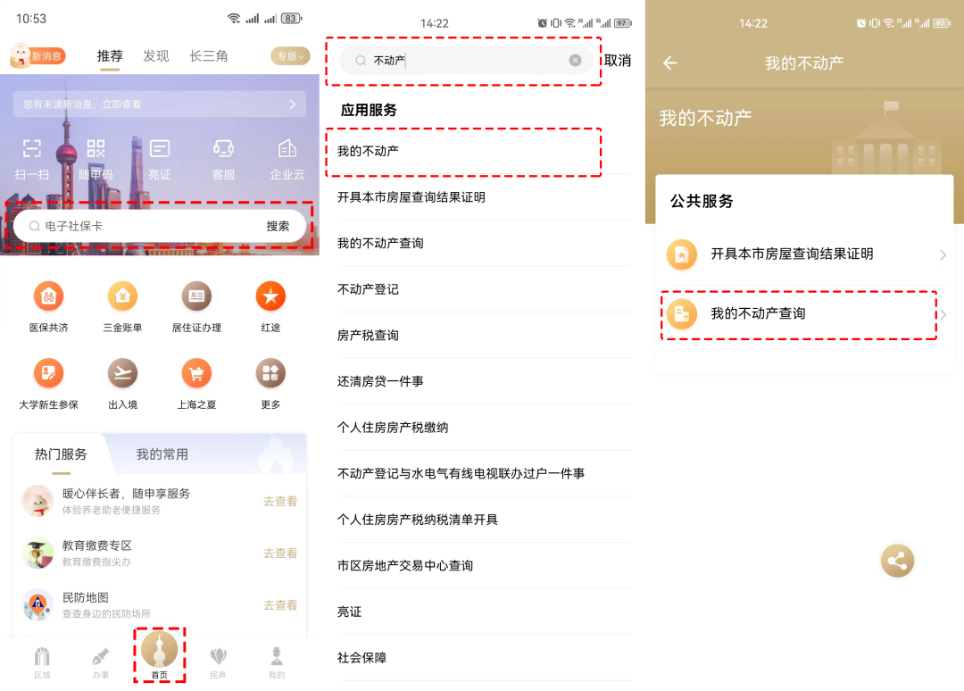 实名登录“随申办市民云”APP→首页搜索框中输入“不动产”→点击“我的不动产”→点击“我的不动产查询”进入服务页面。