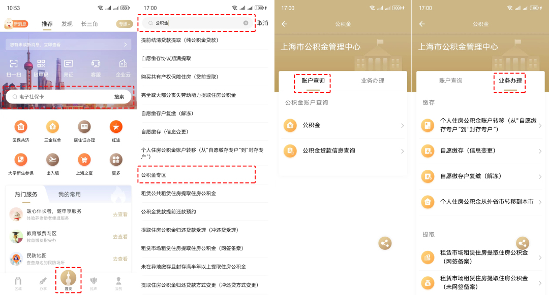 登录“随申办市民云”APP→首页搜索框中输入关键字“公积金”→点击“公积金专区”进入页面后,即可查询和办理各项公积金相关事项。
