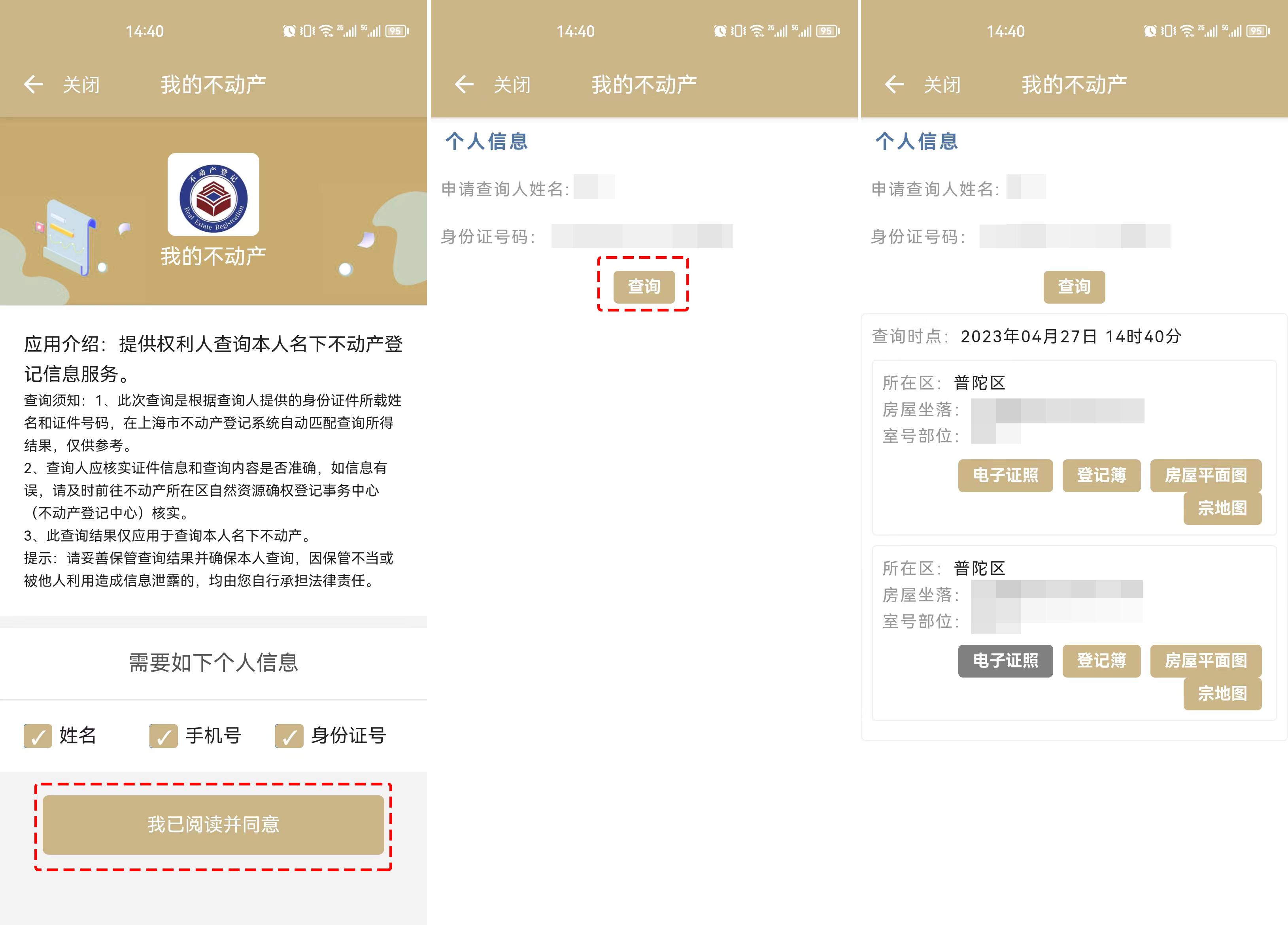 查看应用介绍,点击“我已阅读并同意”→确认基本信息,点击“查询”→可查看房产的电子证照等信息。