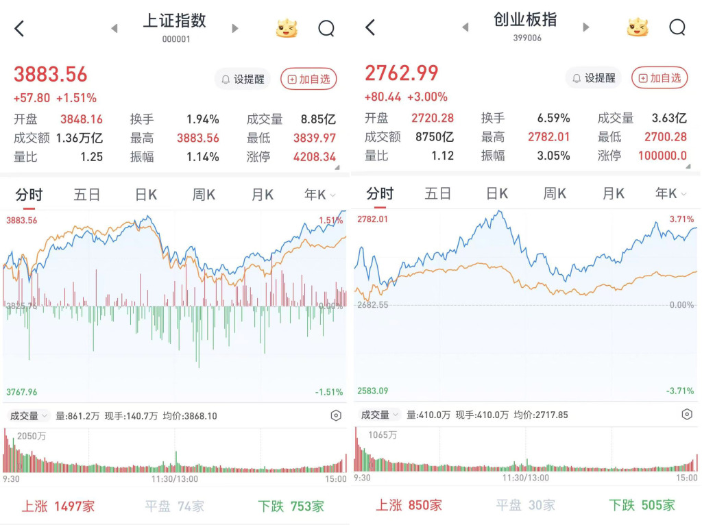 至收盘,上证综指涨1.51%,报3883.56点;科创50指数涨3.2%,报1287.73点;深证成指涨2.26%,报12441.07点;创业板指涨3%,报2762.99点。